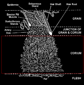 Leather is the fibrous corium or structural part of animal skins as shown here in microscopic cross-section: